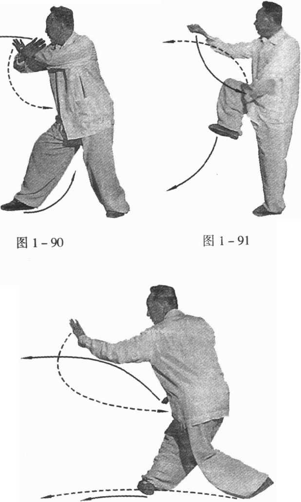 练法、要领和用法均与前“定步崩拳回身”相同(图1- 90、图 1-91、图 1-92)0