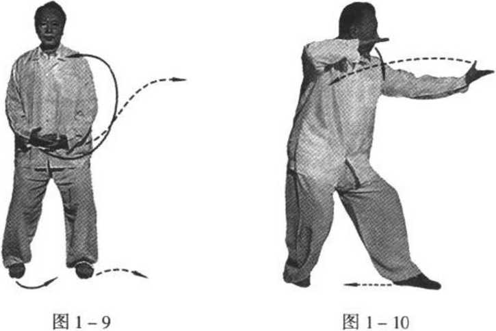 待平心静息、气沉丹田之后,两手由阴掌外旋,变为阳掌, 右手在上,左手在下,仰托于脐前;丹田之气,随两手翻转时, 由下向后、向上、再向前、复再向下翻转一周(谓之翻转丹田); 同时,两腿微向下屈蹲,目平视正前方(图1-9)。
