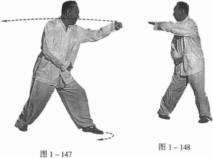 (3)继上动不停,左足向前方进一大步,落成顺足;右足随 之跟进半步,落成外横足,两足成三体步;同时,左手上提至胸 前时,复向前栽出,拳心向下,高与胸齐;右拳变掌,内旋成 阴,循内弧线向下搂领,收至脐前,握成阴拳;上体随之向右旋 转90。,目视左拳(图1 - 147)。