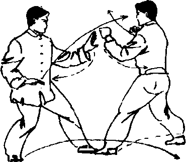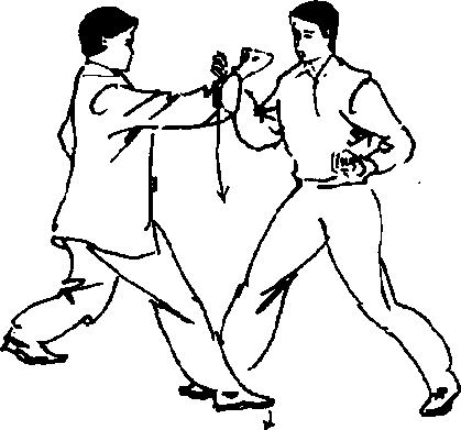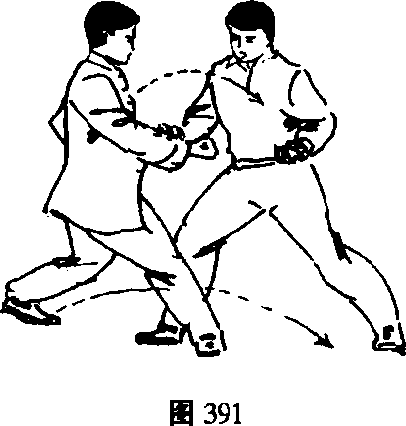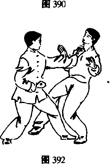 '①我方左三体式站立,敌方站势同上势。(图389)
