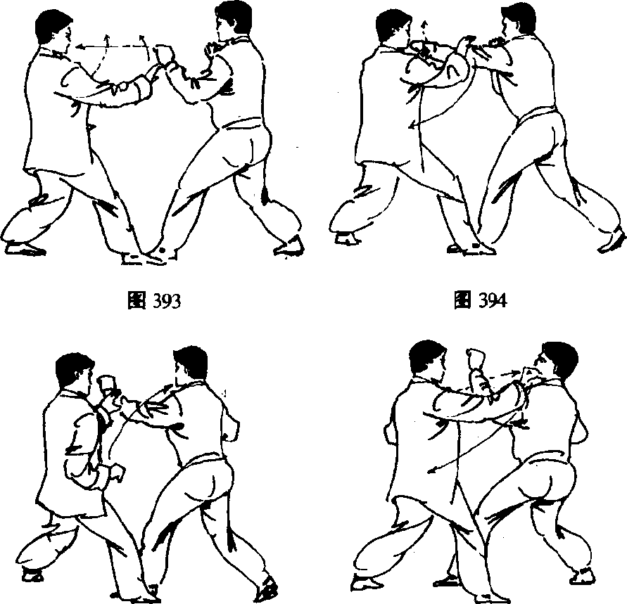 ③ 敌方头部受击,刚欲回撤躲避我拳,我又乘势右拳收204湖鹰?擘营竦决DUH*图395图395图396图396图395图395图396图396回,双手变掌,出左掌向前劈击敌方胸口。(图397)〔技击要点〕双手出击要连贯、迅速、快捷,拧腰旋劲, 脚步稳立,短促发劲。 (