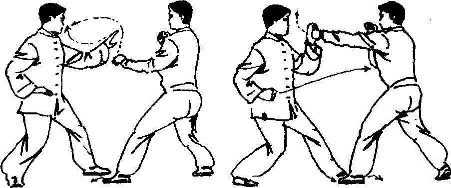 ③ 敌刚一出手,我方又立即变招,左掌向后收回,出右
