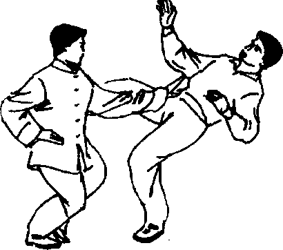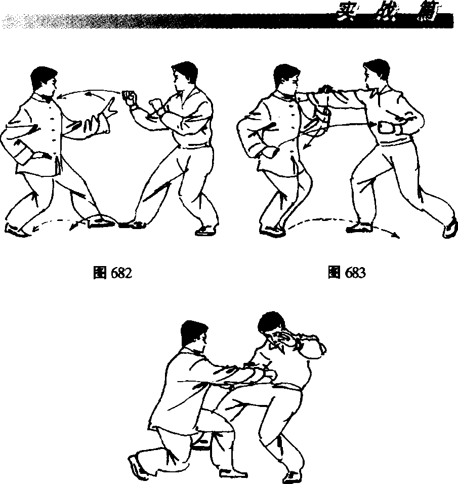 图681(十)顶字功① 我方左三体式站立。敌方双手握拳,右站势站立。 (0 682)② 敌方右脚向前迈进一步,出右直拳向我胸口攻击而 来。我方立即身体后坐并下沉以避,左脚向内收回,脚尖点 地,双腿屈膝半蹲并靠,左手向上、向右拦截敌方右拳。 (图 683)③ 敌方右拳击空收回,我方乘势左脚向前迈进一步,双 腿屈膝半蹲成左跪步。左手向下压按敌方右手臂,出右拳向 前打击敌方腹部。(图684)〔技击要点〕右拳打击要迅速,边拦边击,俯身屈体, 松肩送劲,放长击远。图684