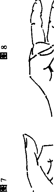 食指、中指向前平齐伸出,略弯,其余三指屈回,拇指 端扣在无名指端上,有击目之功。鸡形多用此掌。(图8)