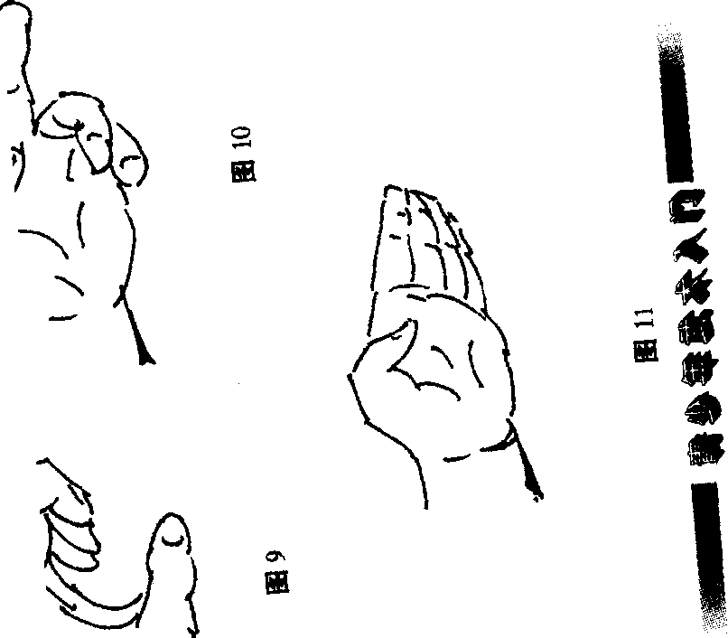 拇指、食指似直非直,圆弧撑开成八字形,掌心内含, 其余三指半屈,有拨转、防护、刁拿、扣击之用。(图9)