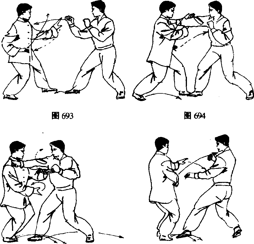 〔技击要点〕双掌两次翻转砍击,转身进步要灵活、敏 捷,拧腰旋劲,插步扣绊,收腹裹裆,屈膝半蹲。双臂外 旋,屈肘横臂,塌腕平掌,力达掌外沿。 311图697