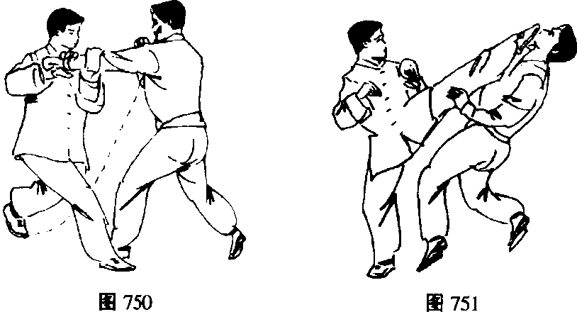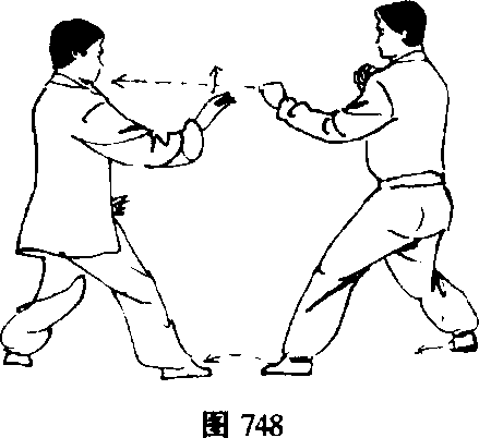 (图 748)① 敌方左脚向前垫步进身,出左直拳向我方头部攻击而 来。我方立即出右手拦截,并反手向右抓拿敌右手腕,身体? 鹰牛寒麝彝AWMK 329向右转,双脚不动成交叉步。出左手向前、向上抓抱敌左手 肘,双手相对紧抱敌手。(图749、750)图749图749图749图749