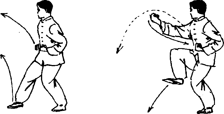 左脚脚尖内扣,右脚脚掌为轴,身体向右、向后转180 度,右拳撤回收抱于腹前,然后又向上经过胸前由下须处向 前上方钻拳伸出,拳心向上;同时右腿屈膝上提,脚尖上图73翘。左腿微屈,目视右拳。(图74、75)〔要点〕转身灵活,右脚提膝与右拳钻出要一同进行。