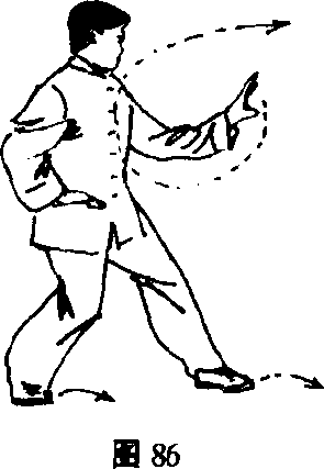 〔要点〕动作连贯,右脚进步与右拳伸抓要同时进行, 短促发力,力达指尖。双手手肘保持一定的弯曲度,不可伸 直,亦附有弹性。