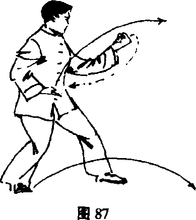 双手变为猴形拳(爪),左拳翻转后,向内收至腹前,手心、 手指向下,手肘屈曲,腕部上凸;右拳向前、向上抓出,高 与胸齐,手肘弯曲,手心、手指斜向前下方。目视右前方。 (图 88)