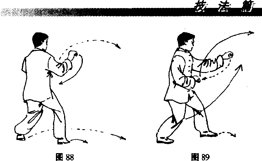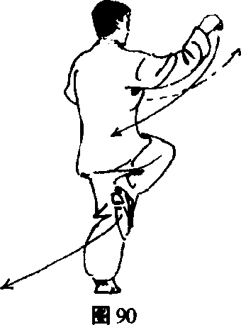 下,屈膝向上提起。同时,左拳屈臂向内收回,置于腹前; 右拳向前、向上伸出抓击,高与头齐。目视右手。(图90)
