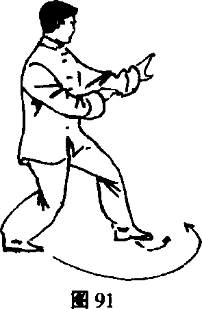 (2)身体向左转,左脚脚尖外撇,右脚向左脚内侧扣 步,成人字形;然后左脚再顺着右脚脚跟方向后撤一大步; 同时右掌由左掌背上面前伸,高与眼平;左掌撤至腹前,两 掌掌心均向下,重心偏于右腿。目视右手。(图92、93)