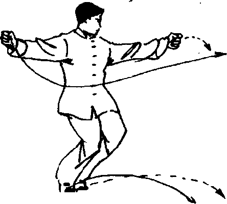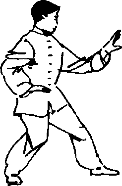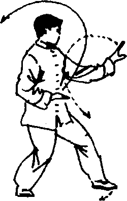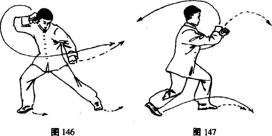 〔要点〕转动时不要过于俯身,以腰为轴,迅速拧转, 左右两拳互为对劲,手臂要有绷弹之力。