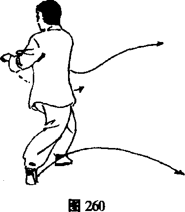左脚向前迈进一步,脚尖内扣,右脚随之从左脚后向左 侧方横插一步,脚前掌着地。同时,双拳一起向内收回抱于 腹前,又向上提至胸口,又再向前双撞打出。(图260)