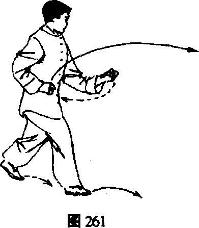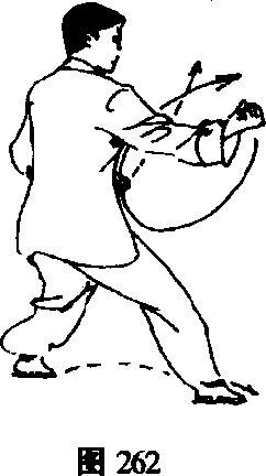 右脚向前垫半步,左脚随之跟步,重心仍坐于左脚上。 右拳向前,从左手臂上向前、向右横拳摆击,左拳收回抱于 左腹前。(图262)