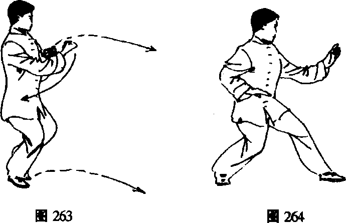 2.上动不停,左脚向前迈出一步,重心仍坐于右腿上。 两拳变掌,左掌从右手上向前扑出;右掌向内、向下收按于 右腰旁。目视左掌,成左三体式。(图264)