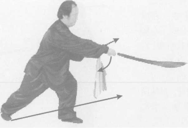 接上式,左脚向前上 一步;同时,左掌前伸,指 尖高与口平;右手持刀内 旋下落至胯侧,刀尖朝 前,刀刃朝下(图9-