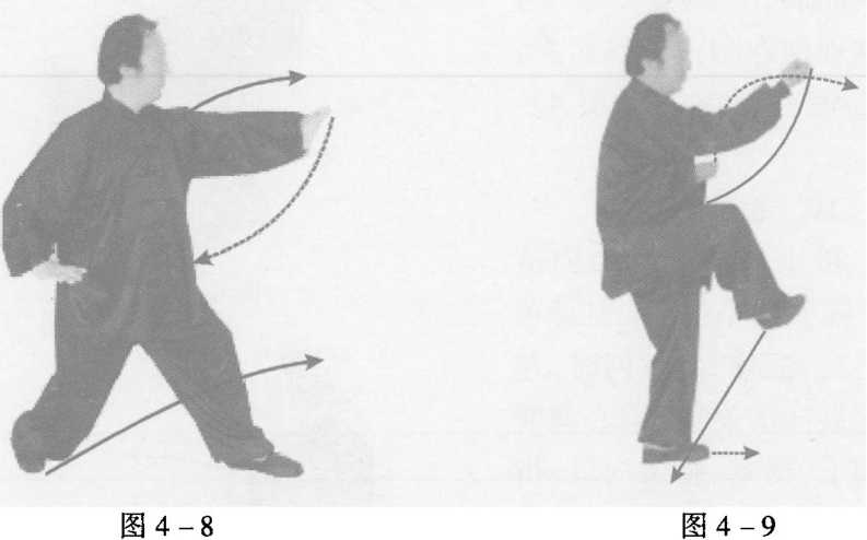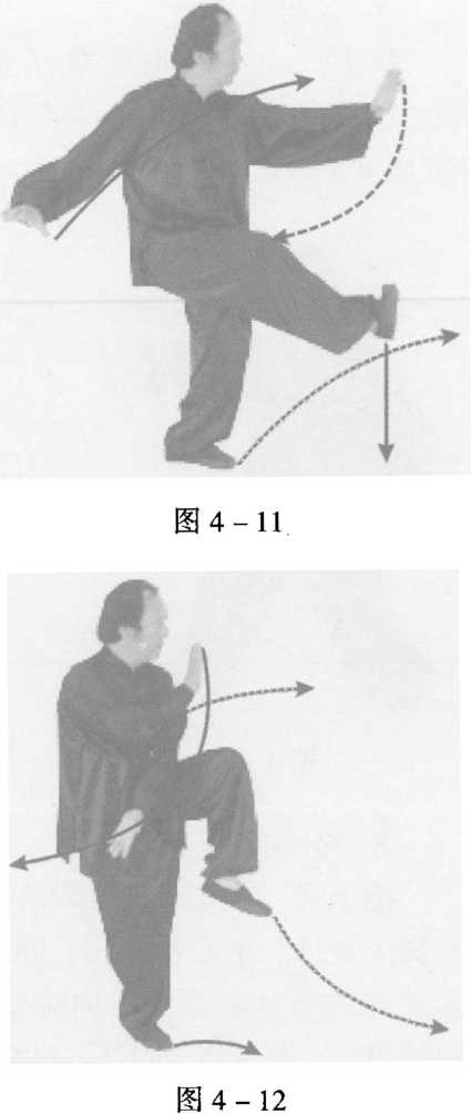 接上式,右脚迅速向前 落地,随势左膝提起,右腿 独立;同时,左掌外旋向右 侧下带落至右肋下,掌心朝 外斜向后;右掌掌心朝下, 经胸前向左肩上插靠肩头, 掌心朝前斜向上(图4- 12)0