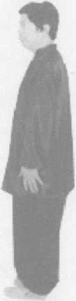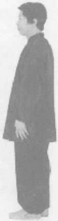 心朝内落至大腿两侧;同时,两腿 随势直立,眼平视前方(收势、踵拳 可以反复连续练习)(图3-25)。