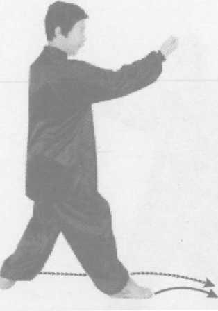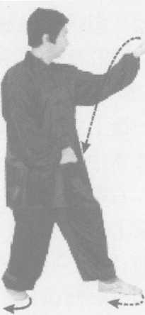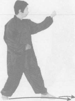 接上式,左脚向前上一步,脚尖微靠中线,右脚在后不变;