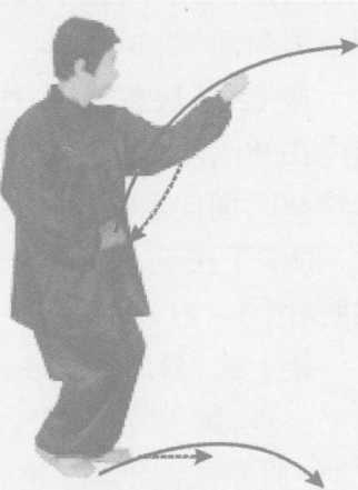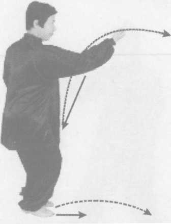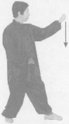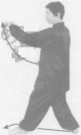 同时,左拳经胸前从右拳上方夕卜旋向前上蹬,高与口平,拳心朝 上斜向前;右拳内旋下按至才娘前,拳心