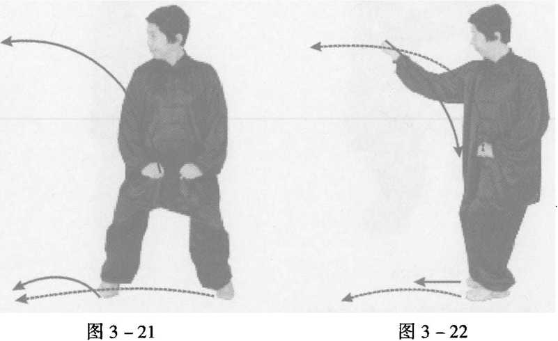 接上式,上身不变,左脚前 寸,脚尖外摆45。;右脚随并,脚尖 点地,脚跟微离地面,重心在左 脚,两腿微弯,膝盖下垂线与脚尖 齐(图 3-17)0