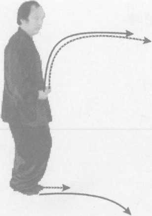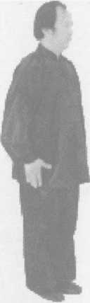 接上式,两掌同时内旋,掌心朝内落至大腿两侧,同时两腿 随势直立,眼平视前方(图4-230)o