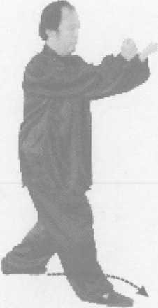 接上式,右脚向前上一步,离中线45。,左脚在后不变;同 时,两拳经胸前向前上攒,高与口平,拳心朝上斜向前,眼视前 方(图 4-228)。