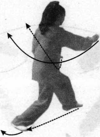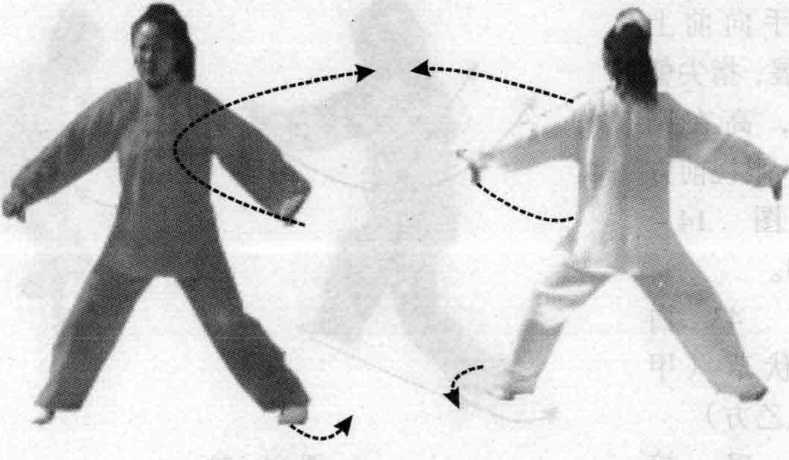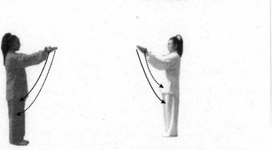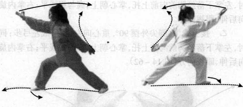 时,左掌下落经胸前向前上托,掌心朝上,高与视线平;右掌内旋 向后伸,眼视前方。