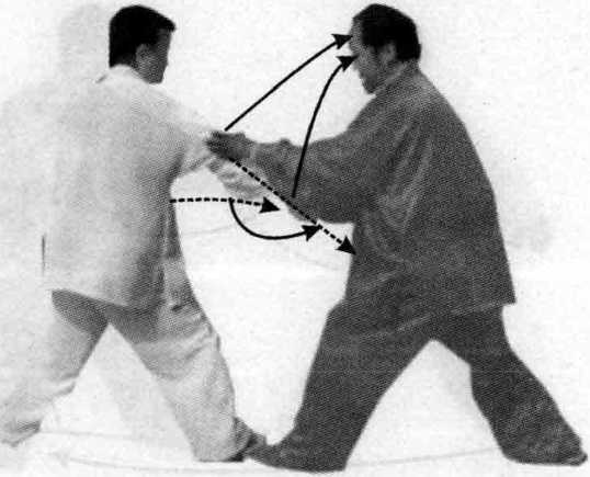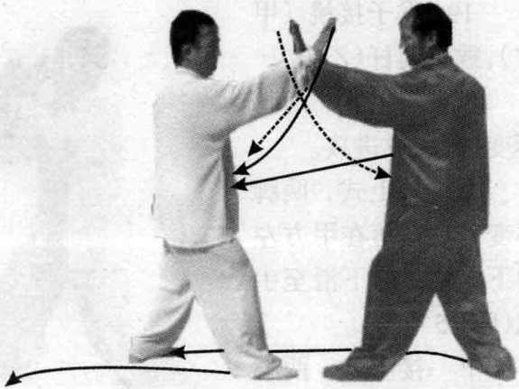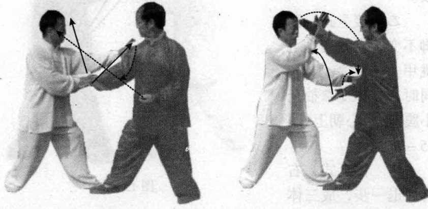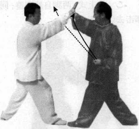 甲接上式,右掌向左摆,接乙方右手腕内侧;同时,左拳前 击乙方胸部,眼视乙方。