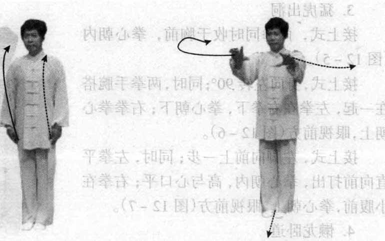1. 起势身体立正站好,眼平视前方(图12-1)。接上式,两掌同时向上抬,掌心朝下,高与肩平(图12- 接上式,两掌同时向下按,往左右撑展,高在肋间(图12 一3)〇