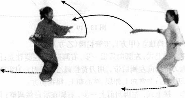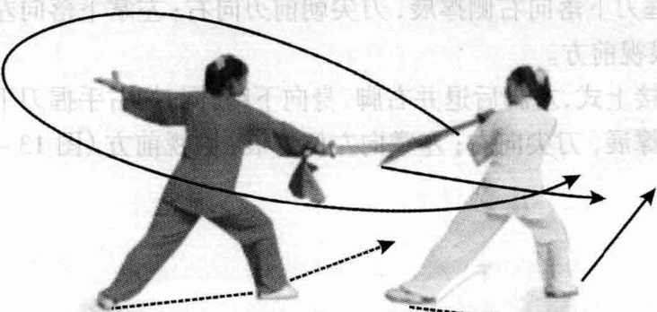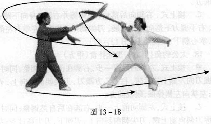左侧后带下落向前横扫至甲方肋间,刀尖朝前刃向右;左掌向后 伸展,掌心朝上高过头,眼视前方(图13-19)。