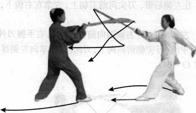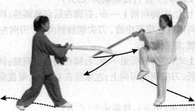 时,右手握刀下落至小腹前,平直向前刺出,刀尖朝前刃向下,高 与心口平;左掌按在右腕上,眼视前方。