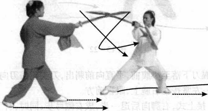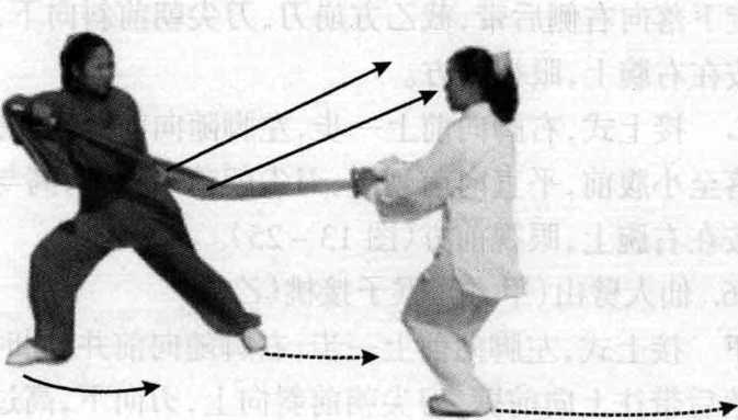 甲 接上式,右脚后退一步,左脚在前自然调整;同时,右手 握刀下落向右侧后带,拦截乙方横刀,刀尖朝前斜向下,刃向右; 左掌按在右腕上,眼视前方。