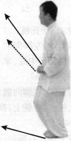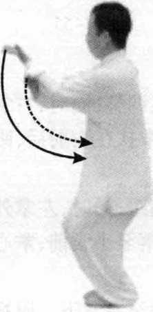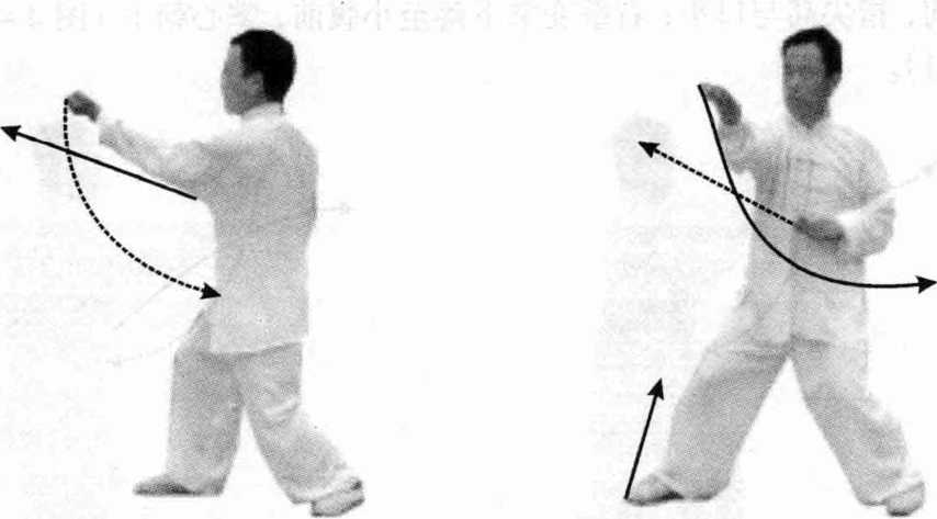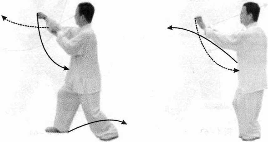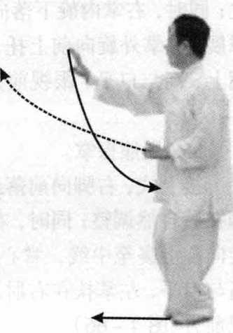 图 4-60图 4-60接上式,两脚不变,右掌向前 伸,掌心朝前,指尖高与口平;左 掌下落至小腹前,掌心朝下,眼视 前方(图4-62)。