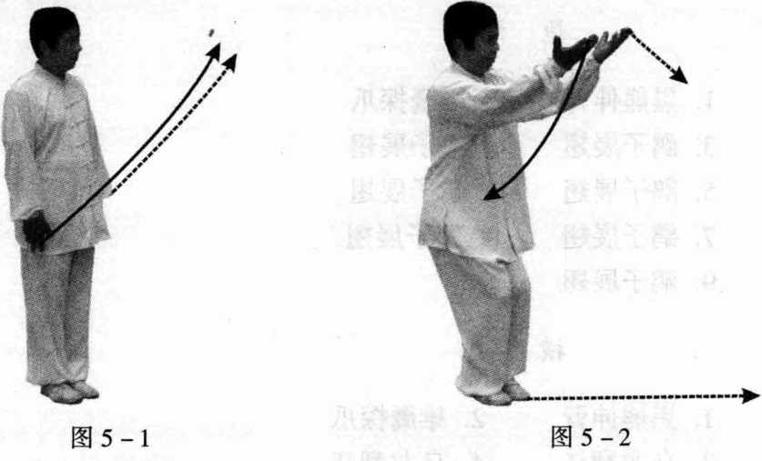 接上式,左右掌同时外旋向前上托,掌心朝上,高与视线平, 两掌之间略宽于肩;两腿微弯,膝盖下垂线与脚尖齐(图5- 2)0