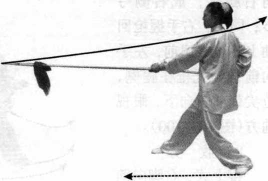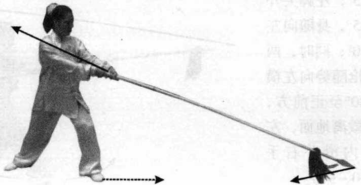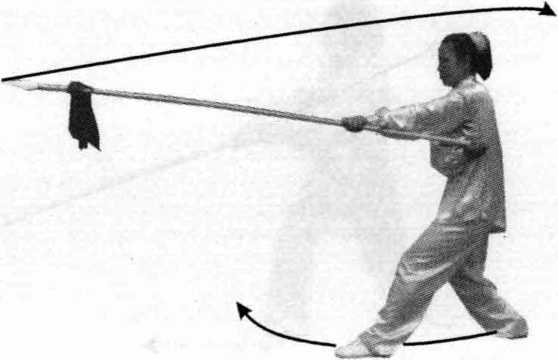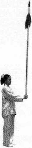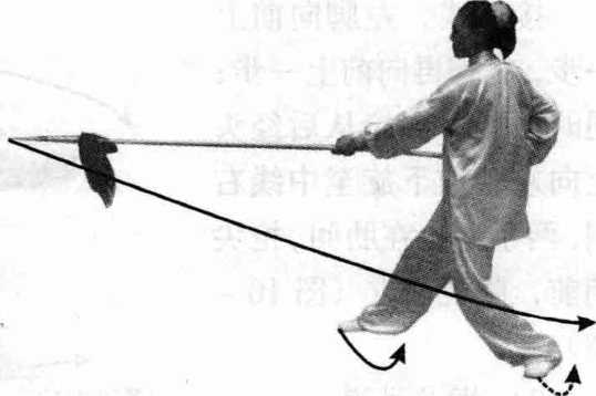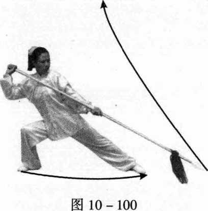 向右腿移,成右侧弓 步;同时,右手握枪回 抽上翻至右肩前,左手 向前滑伸托枪在腿侧, 枪尖朝前斜向下,眼视 前方(图10 - 100)。