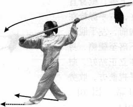 接上式,右脚尖向内 扣135°,左脚尖外 摆135°,身随向左 转180°;同时,两 手握枪随势向左横 扫180。至正前方, 枪尖微离地面,左 手向内滑并右手 (图 10-99)。