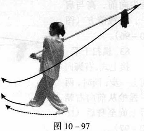 接上式,右脚向 前上一步;同时,两 手握枪从前向右朝 后上旋至身后(图 10-97)