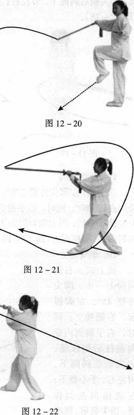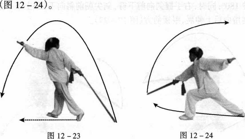 手握剑下落向后横扫至中线,剑尖朝后斜向下,刃左右,手心朝 下;左剑指斜向前上伸展,手心朝上(图12-23)。