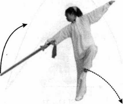 接上式,右脚 向前上一步,脚尖 外摆45。,左脚提 起,右腿独立;同 时,右手握剑内旋 向前往后侧撑展, 剑尖朝前斜向下, 刃左右,手心朝下; 左剑指向左侧撑 展,指尖朝前,眼视