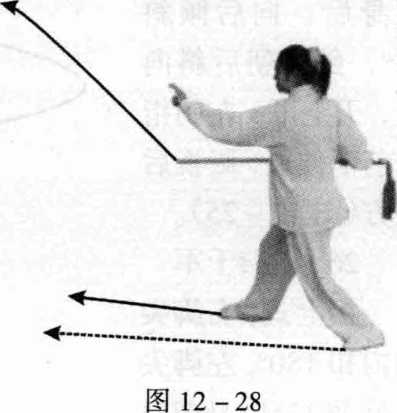 向后带至胯侧,剑尖朝前刃 左右,手心朝下;左剑指向前 伸展,指尖高与口平,眼视前 方(图 12-28)O
