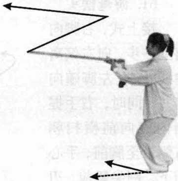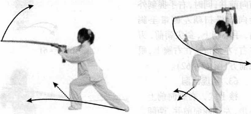 接上式,右脚向 前上一步,向右偏离 中线45。,左脚随向 前并;同时,右手握 剑内旋向前横扫朝 右侧带至胸前,手心 朝下,剑尖朝前,刃 左右;左剑指按在右