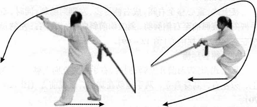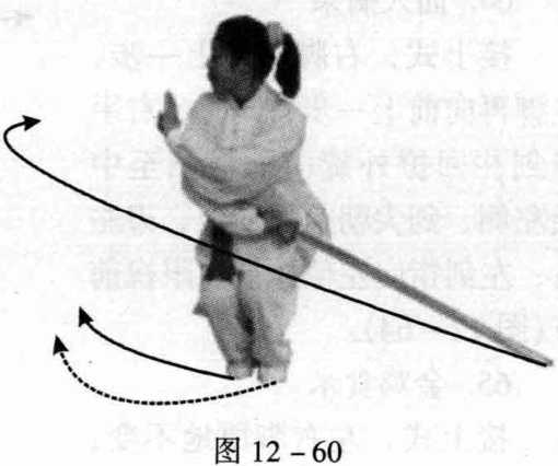 接上式,左脚向前落地,脚尖外摆45°,右脚随向前并,身向 下蹲;同时,右手握剑下落横扫至左侧后,剑尖朝后斜向下,刃 左右;左剑指向右肩前插,眼视前方(图12-60)。