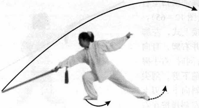 接上式,左脚向前上一 步,向左偏离中线45。,右脚 随向前并;同时,右手握剑外 旋向前横扫朝左侧带至胸 前,手心朝上,剑尖朝前,刃