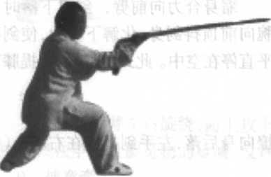 接上式,右脚向前寸步,左脚在后自然调整,身向下蹲;同时,右手握剑外旋向