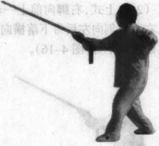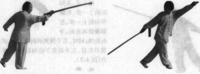 (2) 接上式,左脚向前上一步,右脚再向前上一步,右脚尖外摆,左脚跟微离地 面;同时,右手握剑下落向后伸展,剑尖向后斜向下,刃左右;左手剑指斜向前上伸 展,手心向上,眼视右侧后(图4-1 Do