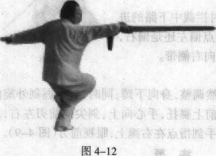 (2) 接上式,右脚向前上一步,脚尖向内扣45。,左脚随向前并,身向下蹲;同 时,右手握剑向左后带下落横向前下扫,剑尖朝前斜向下,刃左右,左手剑指向后伸 展,眼视前下方(图4-16)。
