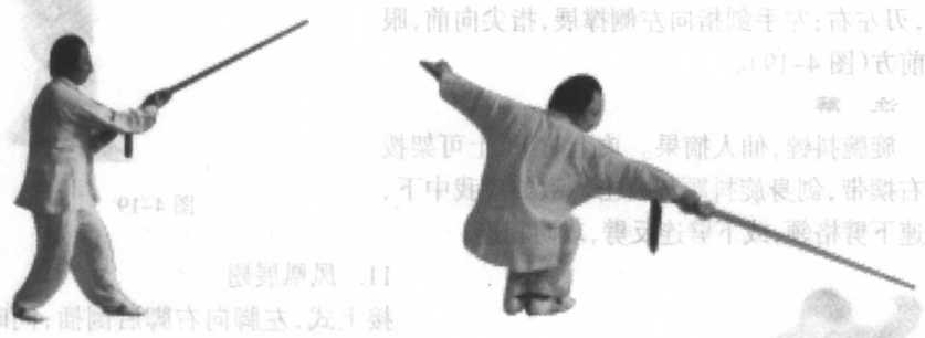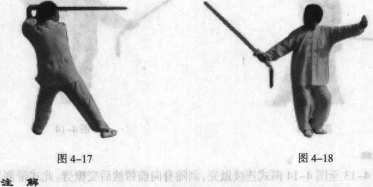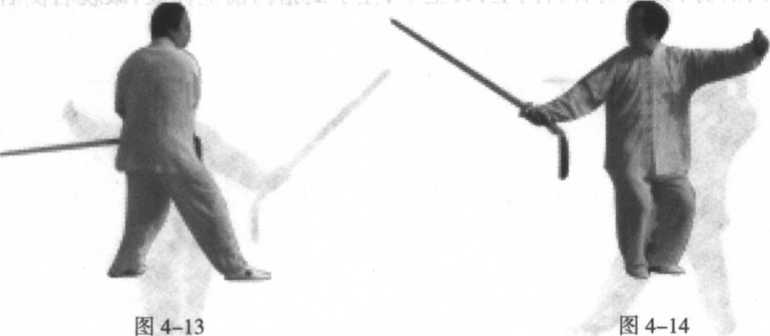从图4-13至图4-14两式连续做完,剑随身向前带然后变撩劈。此式带剑是防 守,转身撩劈是进攻。身法上下起伏左右摆,落势准备领剑。
