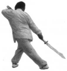 倒插步在步法中是最灵活的一种步型,进退灵活, 左右旋摆,能迅速调整进攻角度,有利于刀法的变化。 此式撩劈紧相连,上撩时如遇力大者即变下劈,从上直 下封中门直取其根,或旋搅抽架,横扫崩刺随势变化。